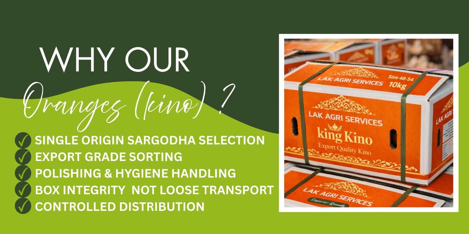 Lak Agri Services was built to bring export-grade agricultural discipline into everyday homes. We work directly with Sargodha farms, selecting, polishing and packing King Kino using the same standards applied to international shipments. Every box is handled with control — not speed, not volume — because quality is preserved through process, not promises. What we deliver is not market fruit. It is certainty, packed with care and delivered with accountability.